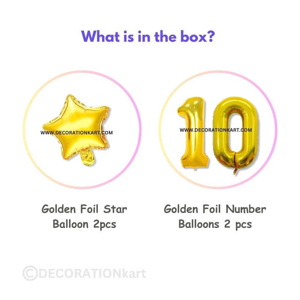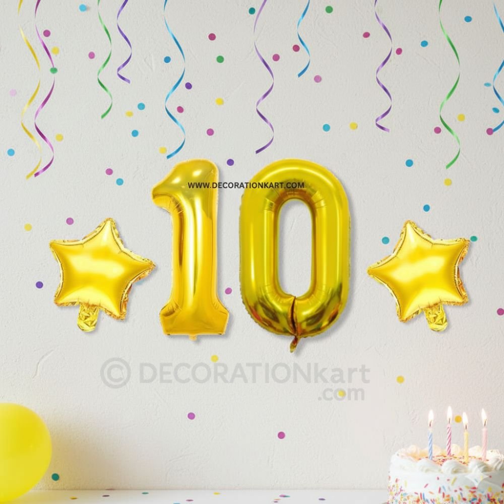 A premium 3-piece balloon combo featuring one golden number "10" (16 inch) and two golden stars (10 inch each) โ perfect for marking first birthdays, anniversaries, or milestone events. - PREMIUM QUALITY MATERIAL: