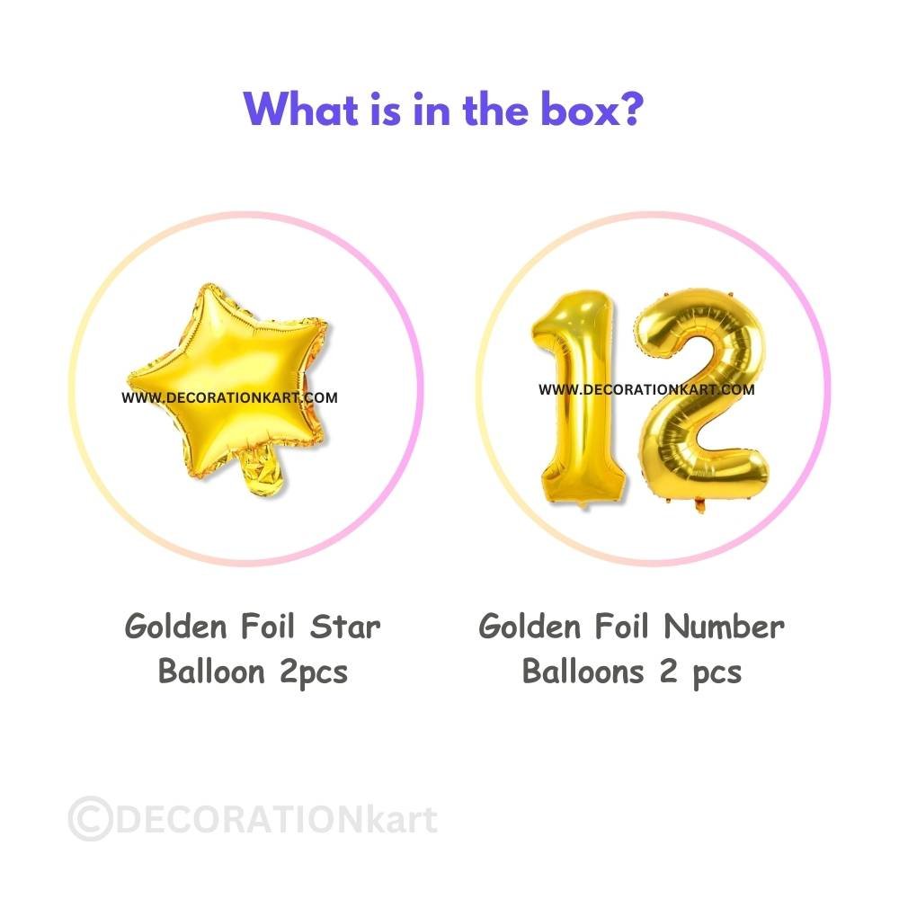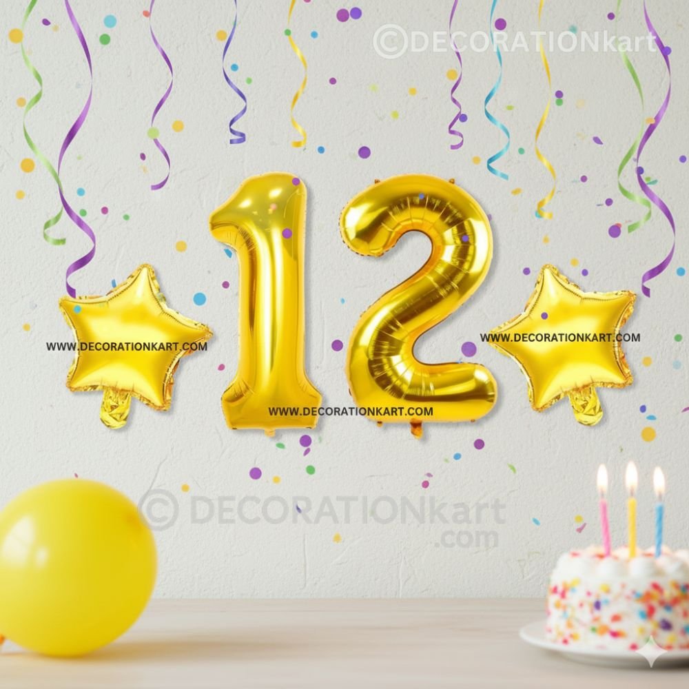 A premium 3-piece balloon combo featuring one golden number "12" (16 inch) and two golden stars (10 inch each) โ perfect for marking first birthdays, anniversaries, or milestone events. - PREMIUM QUALITY MATERIAL: