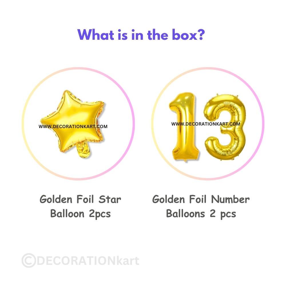 A premium 3-piece balloon combo featuring one golden number "13" (16 inch) and two golden stars (10 inch each) โ perfect for marking first birthdays, anniversaries, or milestone events. - PREMIUM QUALITY MATERIAL: