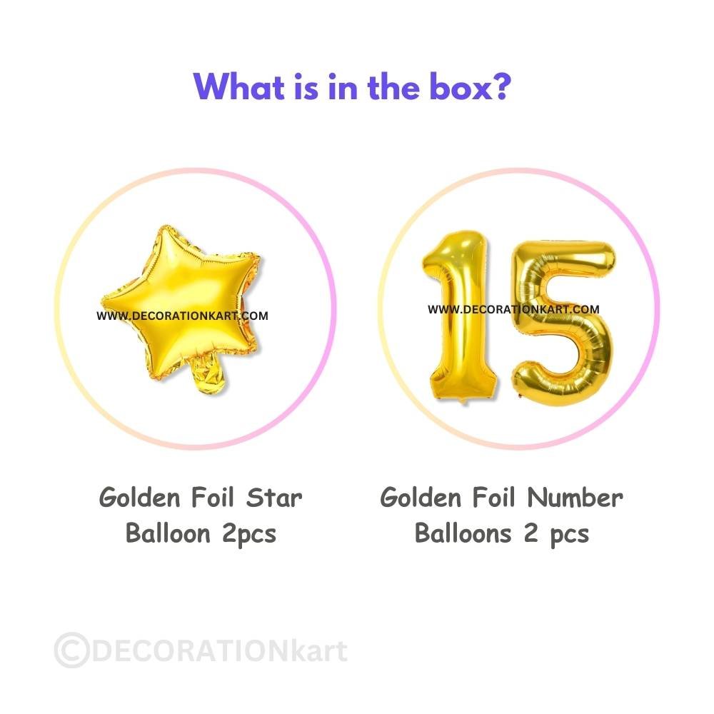 A premium 3-piece balloon combo featuring one golden number "15" (16 inch) and two golden stars (10 inch each) โ perfect for marking first birthdays, anniversaries, or milestone events. - PREMIUM QUALITY MATERIAL: