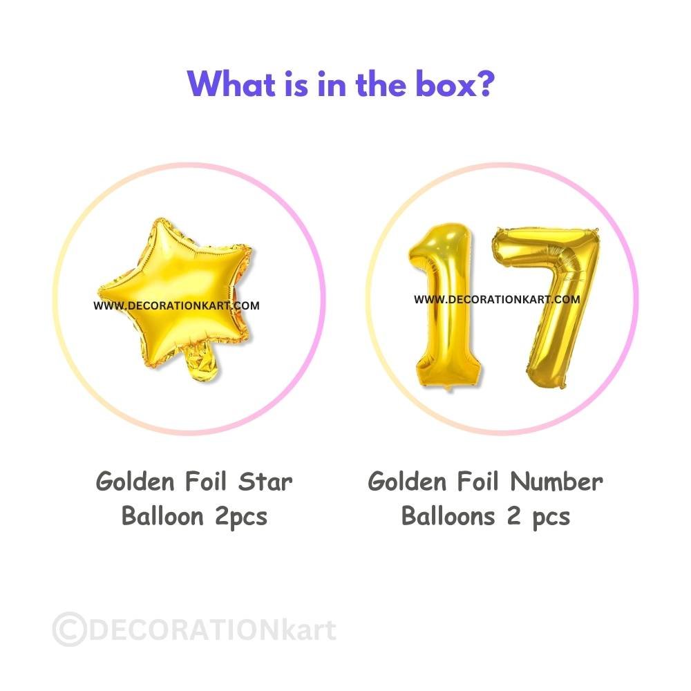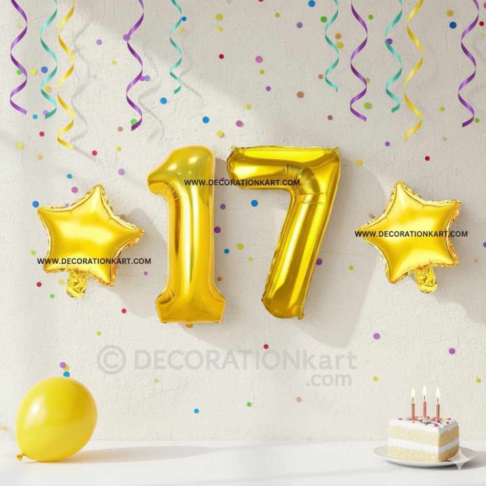 A premium 3-piece balloon combo featuring one golden number "17" (16 inch) and two golden stars (10 inch each) โ perfect for marking first birthdays, anniversaries, or milestone events. - PREMIUM QUALITY MATERIAL: