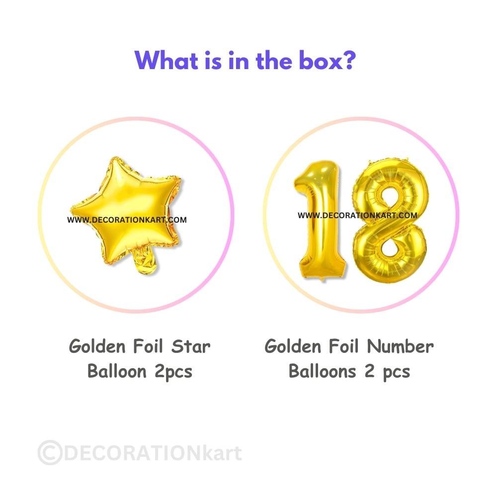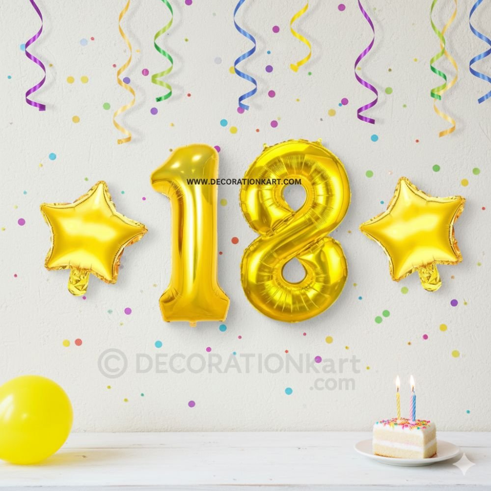 A premium 3-piece balloon combo featuring one golden number "18" (16 inch) and two golden stars (10 inch each) โ perfect for marking first birthdays, anniversaries, or milestone events. - PREMIUM QUALITY MATERIAL: