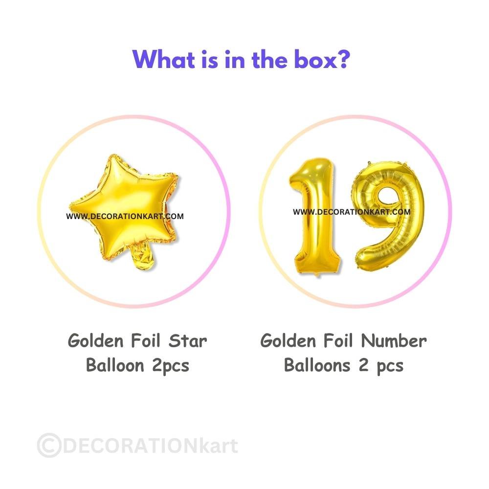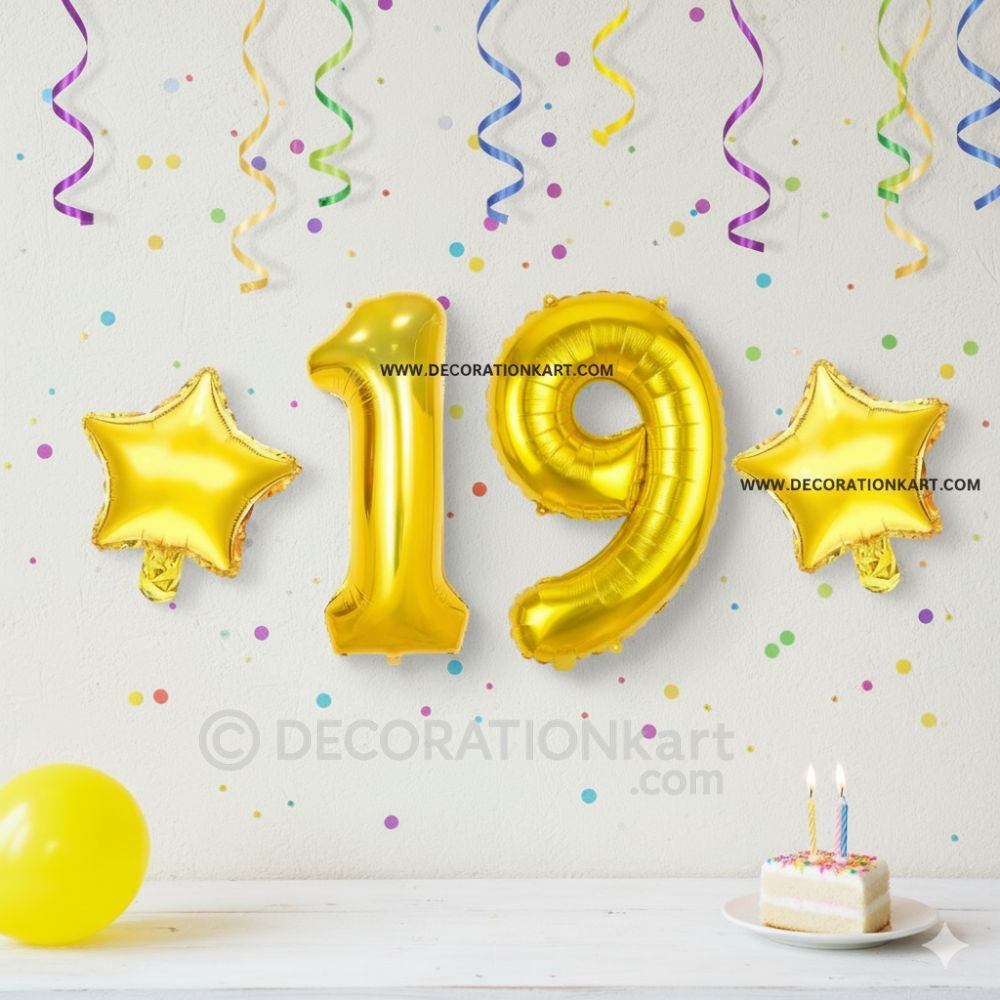 A premium 3-piece balloon combo featuring one golden number "19" (16 inch) and two golden stars (10 inch each) โ perfect for marking first birthdays, anniversaries, or milestone events. - PREMIUM QUALITY MATERIAL: