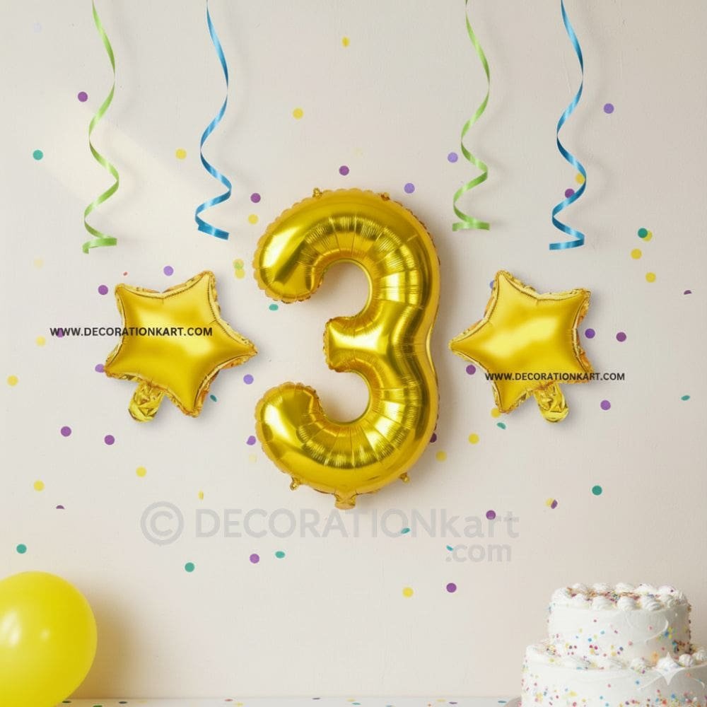 A premium 3-piece balloon combo featuring one golden number '3' (16 inch) and two golden stars (10 inch each) โ€” perfect for marking first birthdays, anniversaries, or milestone events.
