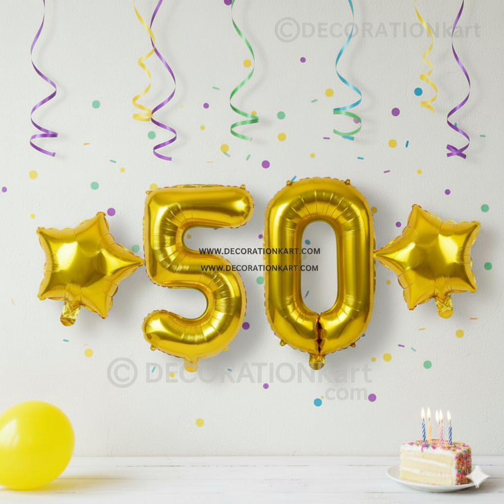 A premium 3-piece balloon combo featuring one golden number "50" (16 inch) and two golden stars (10 inch each) โ perfect for marking first birthdays, anniversaries, or milestone events. - PREMIUM QUALITY MATERIAL: