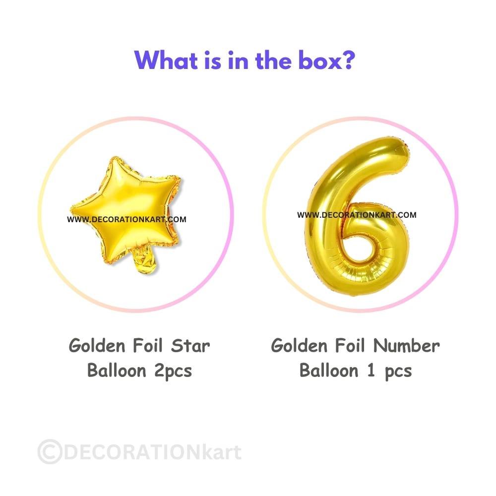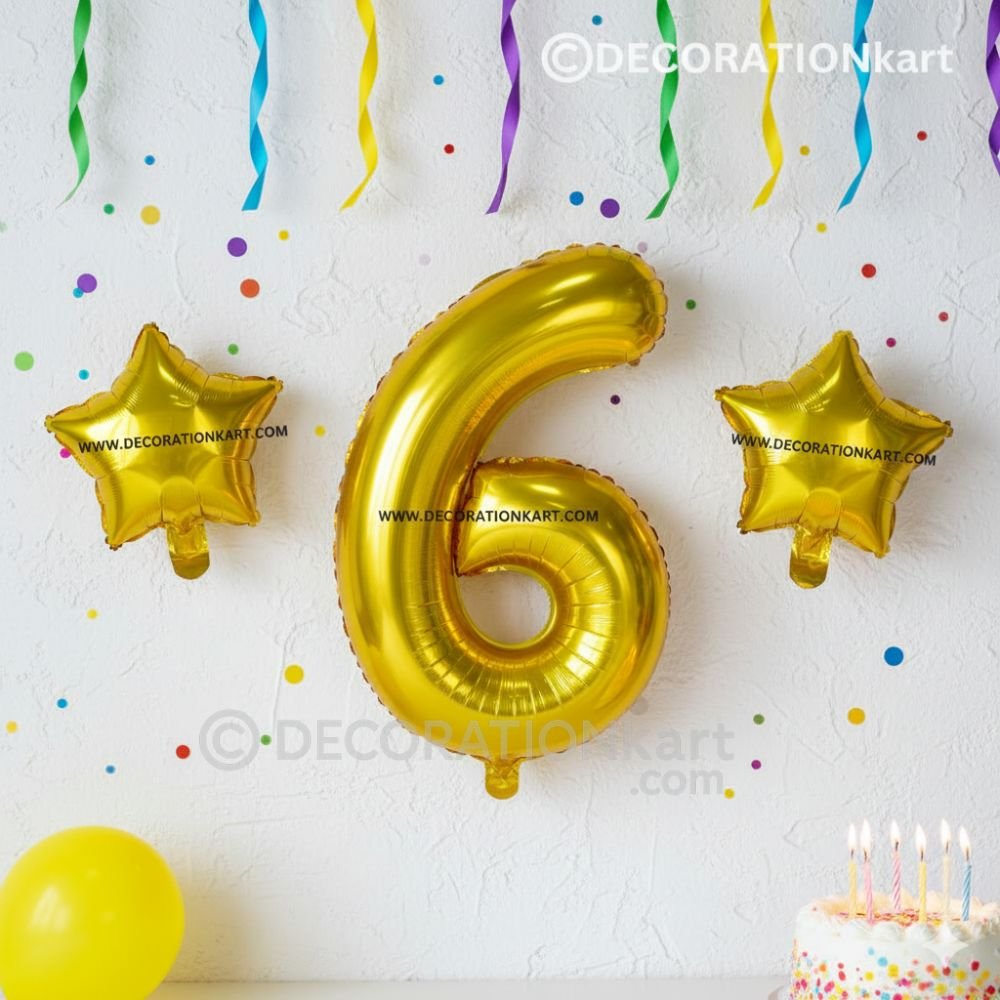 A premium 3-piece balloon combo featuring one golden number "6" (16 inch) and two golden stars (10 inch each) โ€” perfect for marking first birthdays, anniversaries, or milestone events.