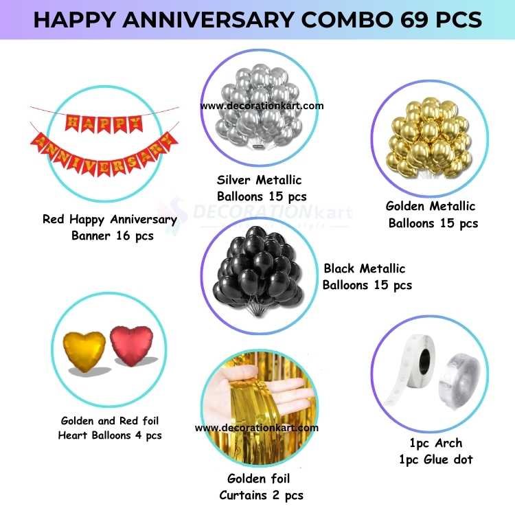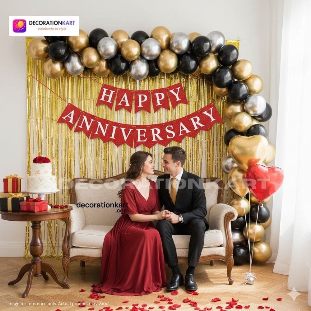 - Anniversaries are milestones that celebrate love, commitment, and togetherness. They deserve to be marked with décor that feels both elegant and festive. The DECORATIONkart 69 Pcs Happy Anniversary Party Decoration DIY Kit is designed to make your celebrations effortless yet stunning. With a bold red cardstock banner, shimmering golden curtains, and a sophisticated mix of metallic balloons in golden, black, and silver, this kit transforms any space into a romantic, stylish, and picture‑perfect celebration zone. Whether you’re planning a surprise for your partner, decorating for your parents’ anniversary, or hosting a grand family gathering, this all‑in‑one kit ensures your décor looks professional, vibrant, and full of life.