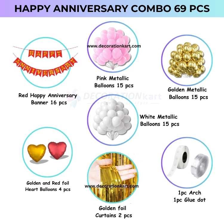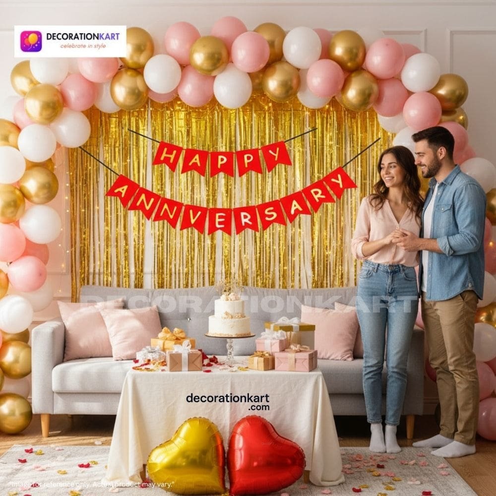 - Anniversaries are milestones that celebrate love, commitment, and togetherness. They deserve to be marked with décor that feels both elegant and festive. The DECORATIONkart 69 Pcs Happy Anniversary Party Decoration DIY Kit is designed to make your celebrations effortless yet stunning. With a bold red cardstock banner, shimmering golden curtains, and a romantic mix of metallic balloons in golden, pink, and white, this kit transforms any space into a stylish, heartfelt, and picture‑perfect celebration zone. Whether you’re planning a surprise for your partner, decorating for your parents’ anniversary, or hosting a grand family gathering, this all‑in‑one kit ensures your décor looks professional, vibrant, and full of life.