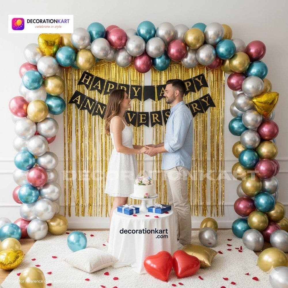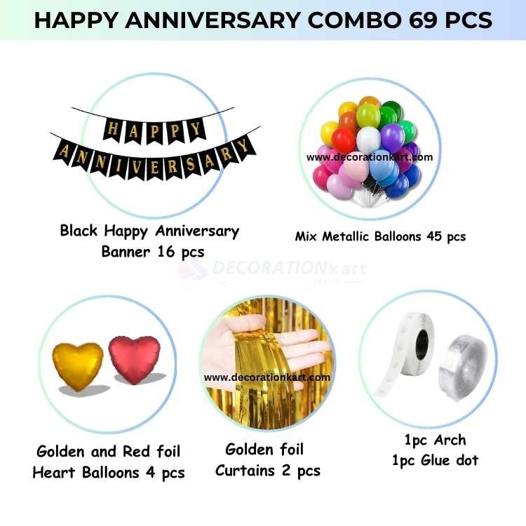 - Anniversaries are milestones that celebrate love, commitment, and togetherness. They deserve to be marked with décor that feels both elegant and festive. The DECORATIONkart 69 Pcs Happy Anniversary Party Decoration DIY Kit is designed to make your celebrations effortless yet stunning. With a bold black cardstock banner, shimmering golden curtains, and a vibrant mix of multicolor metallic balloons, this kit transforms any space into a stylish, heartfelt, and picture‑perfect celebration zone. Whether you’re planning a surprise for your partner, decorating for your parents’ anniversary, or hosting a grand family gathering, this all‑in‑one kit ensures your décor looks professional, vibrant, and full of life.