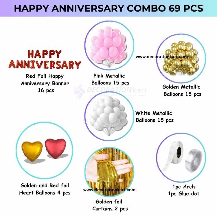 - Celebrate your love story with elegance, warmth, and a splash of romance using the DECORATIONkart 69 Pcs Happy Anniversary Party Decoration DIY Kit. This thoughtfully curated combo is designed to transform any space into a dreamy celebration zone, whether you’re planning a surprise for your partner, decorating for your parents’ anniversary, or hosting a cozy family gathering.
