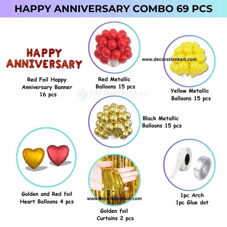 - Celebrate your love story with vibrant elegance using the DECORATIONkart 69 Pcs Happy Anniversary Party Decoration DIY Kit — a complete combo designed to transform any space into a romantic and festive celebration zone. Whether you're planning a surprise for your partner, decorating for your parents’ anniversary, or hosting a cozy family gathering, this kit delivers a premium look with effortless DIY setup.