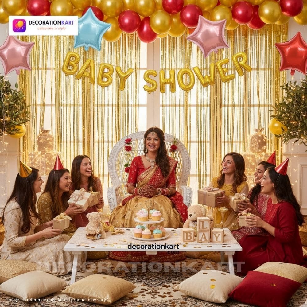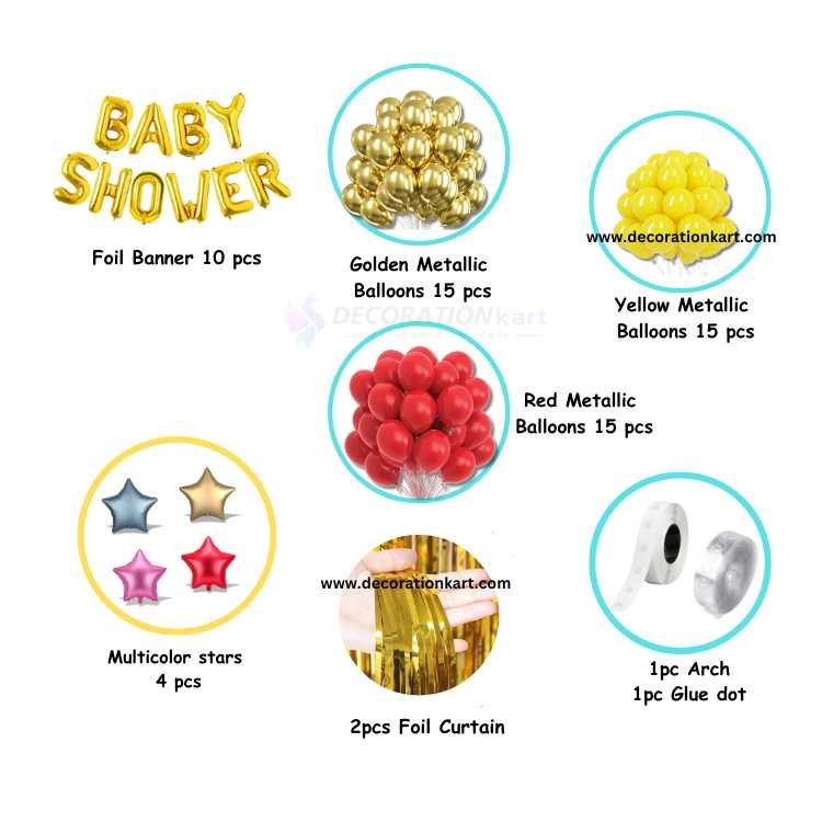 - Welcome your little one with a burst of color, joy, and elegance using the DECORATIONkart 63 Pcs Baby Shower Party Decoration DIY Kit. Designed to create a heartwarming and festive atmosphere, this combo is perfect for baby showers, gender reveal parties, or welcome baby celebrations. Whether you're decorating a cozy home space, a banquet hall, or an outdoor garden, this kit brings together premium materials, vibrant colors, and effortless DIY charm.