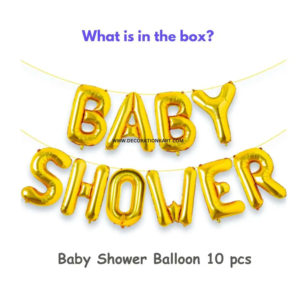 - When it comes to welcoming a new baby, décor plays a huge role in creating a warm and joyful atmosphere. DECORATIONkart BABY SHOWER Golden Foil Balloons are designed to make your baby shower or gender reveal unforgettable. Crafted with premium quality foil and finished in a rich metallic golden shine, this balloon set spells out “BABY SHOWER” in bold, eye‑catching letters. Whether you’re hosting an intimate family gathering or a grand celebration, these balloons instantly create a festive backdrop that guests will love.