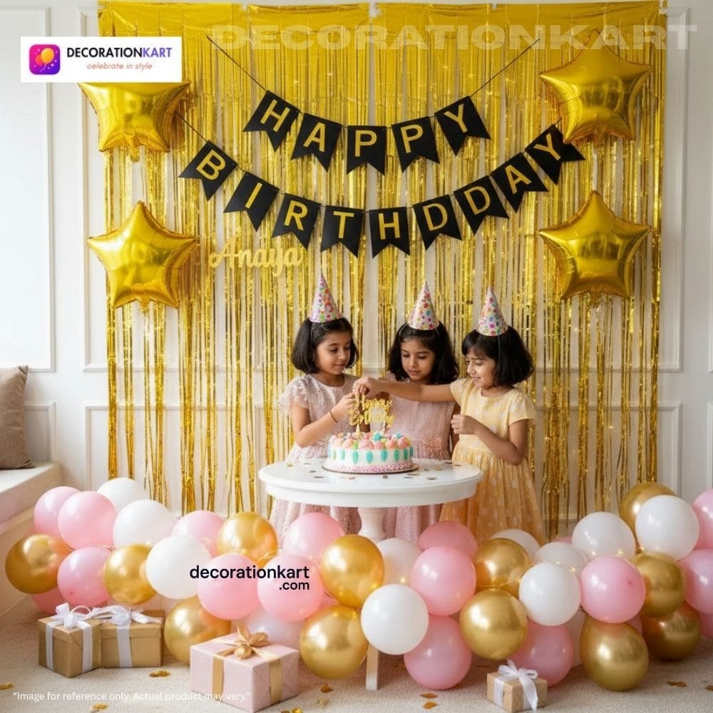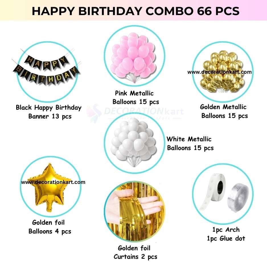 - Birthdays are milestones that deserve to be celebrated with elegance, sparkle, and unforgettable memories. The DECORATIONkart 66 Pcs Birthday Party Decoration DIY Kit is designed to make your celebrations effortless yet stunning. With a bold black cardstock banner, shimmering golden curtains, and a vibrant mix of metallic balloons in golden, pink, and white, this kit transforms any space into a stylish, festive, and picture‑perfect party zone. Whether you’re planning a child’s birthday, a teenager’s milestone, or an adult’s surprise party, this all‑in‑one kit ensures your décor looks professional, vibrant, and full of life.