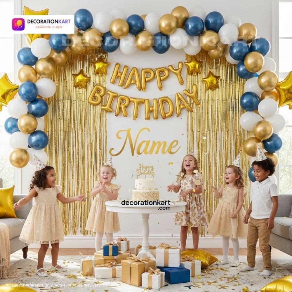 This premium kit from DECORATIONkart is crafted for convenience and visual impact. At the heart of the setup is a radiant golden foil “Happy Birthday” banner with 16-inch letters that instantly sets the tone for celebration. Paired with two shimmering golden fringe curtains, the backdrop becomes a luxurious focal point perfect for cake-cutting ceremonies, selfies, and group photos. The coordinated gold theme ensures a polished, professional look that suits any age group. - 🎈 Metallic Balloons in Elegant Shades: