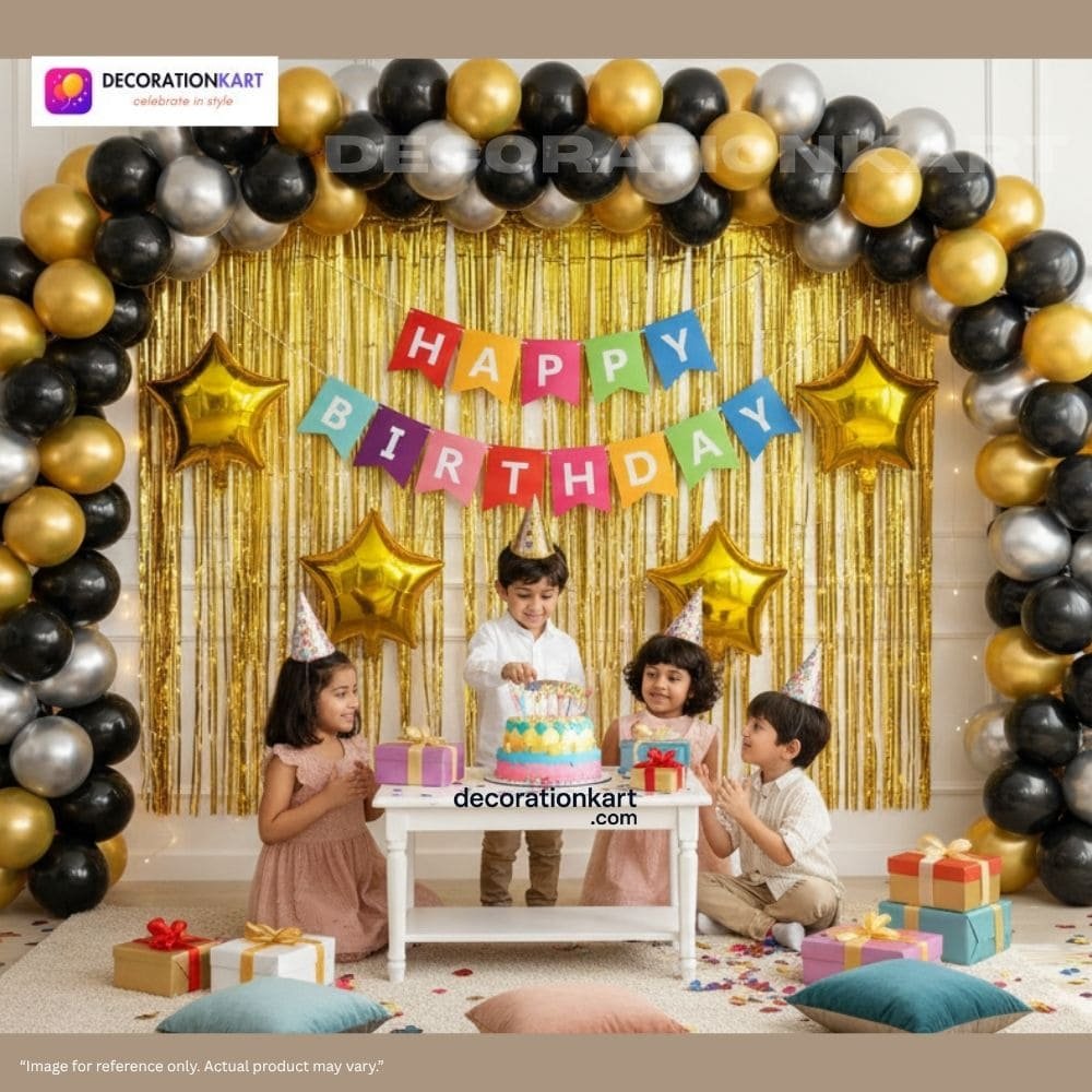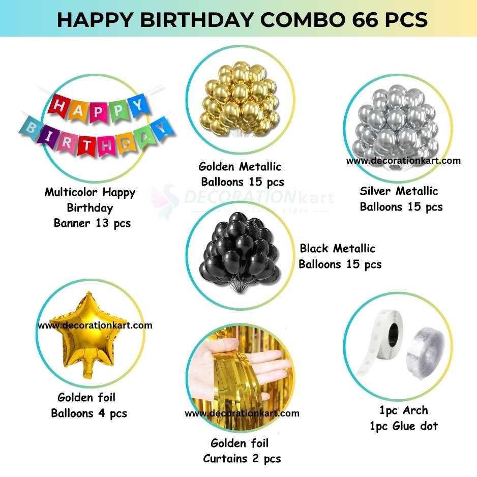 - Birthdays are milestones that deserve to be celebrated with joy, color, and unforgettable memories. The DECORATIONkart 66 Pcs Birthday Party Decoration DIY Kit is designed to make your celebrations effortless yet stunning. With a vibrant multicolor cardstock banner, shimmering golden curtains, and a bold mix of metallic balloons in golden, black, and silver, this kit transforms any space into a stylish, festive, and picture‑perfect party zone. Whether you’re planning a child’s birthday, a teenager’s milestone, or an adult’s surprise party, this all‑in‑one kit ensures your décor looks professional, vibrant, and full of life.