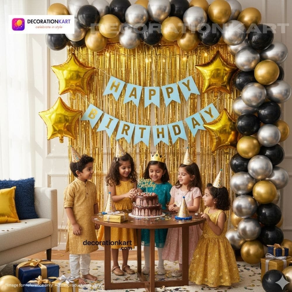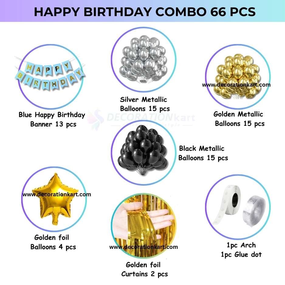 - Birthdays are milestones that deserve to be celebrated with elegance, sparkle, and unforgettable memories. The DECORATIONkart 66 Pcs Birthday Party Decoration DIY Kit is designed to make your celebrations effortless yet stunning. With a bold blue cardstock banner, shimmering golden curtains, and a sophisticated mix of metallic balloons in golden, black, and silver, this kit transforms any space into a stylish, festive, and picture‑perfect party zone. Whether you’re planning a child’s birthday, a teenager’s milestone, or an adult’s surprise party, this all‑in‑one kit ensures your décor looks professional, vibrant, and full of life.
