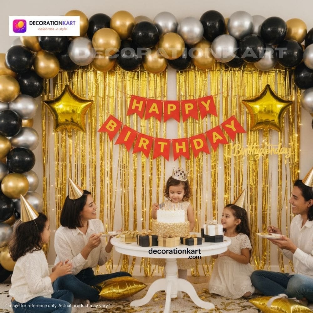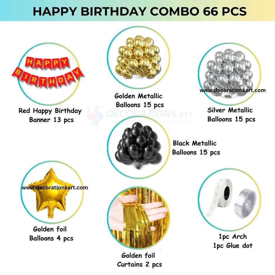 - Celebrate birthdays with elegance, energy, and effortless style using the DECORATIONkart 66 Pcs Birthday Party Decoration DIY Kit. This thoughtfully curated set combines bold colors, metallic accents, and premium materials to transform any space into a festive celebration zone. Whether you’re hosting a child’s birthday, a milestone party, or a surprise event, this kit ensures your décor looks professional, vibrant, and unforgettable.
