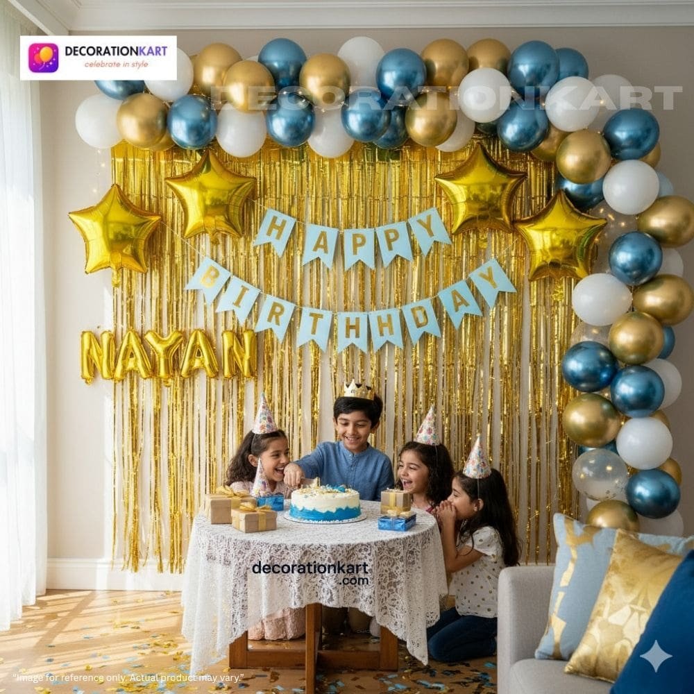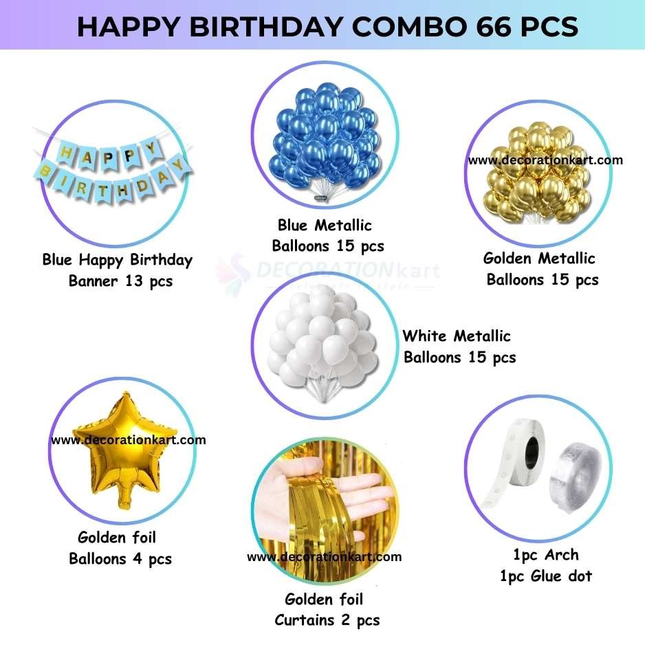 - Birthdays are milestones that deserve to be celebrated with joy, color, and unforgettable memories. The DECORATIONkart 66 Pcs Birthday Party Decoration DIY Kit is designed to make your celebrations effortless yet stunning. With a bold blue cardstock banner, shimmering golden curtains, and a vibrant mix of metallic balloons in golden, blue, and white, this kit transforms any space into a stylish, festive, and picture‑perfect party zone. Whether you’re planning a child’s birthday, a teenager’s milestone, or an adult’s surprise party, this all‑in‑one kit ensures your décor looks professional, vibrant, and full of life.