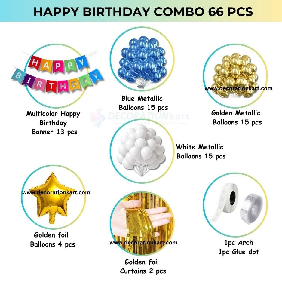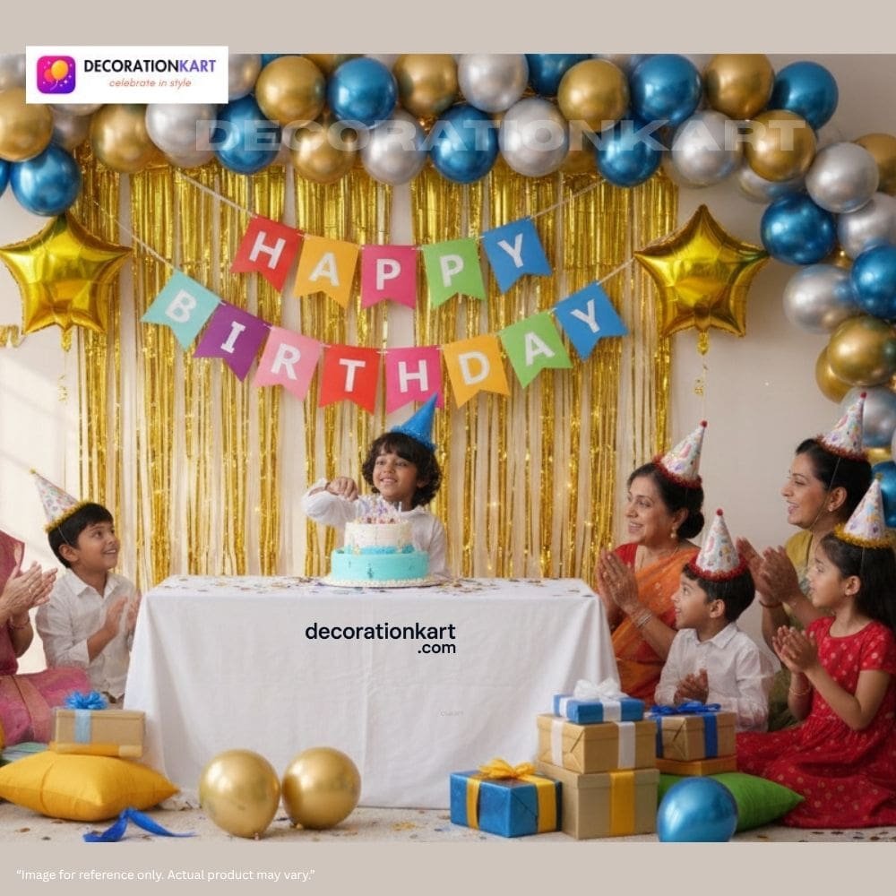 - Birthdays are milestones that deserve to be celebrated with joy, color, and unforgettable memories. The DECORATIONkart 66 Pcs Birthday Party Decoration DIY Kit is designed to make your celebrations effortless yet stunning. With a vibrant multicolor cardstock banner, shimmering golden curtains, and a bold mix of metallic balloons in golden, blue, and white, this kit transforms any space into a stylish, festive, and picture‑perfect party zone. Whether you’re planning a child’s birthday, a teenager’s milestone, or an adult’s surprise party, this all‑in‑one kit ensures your décor looks professional, vibrant, and full of life.