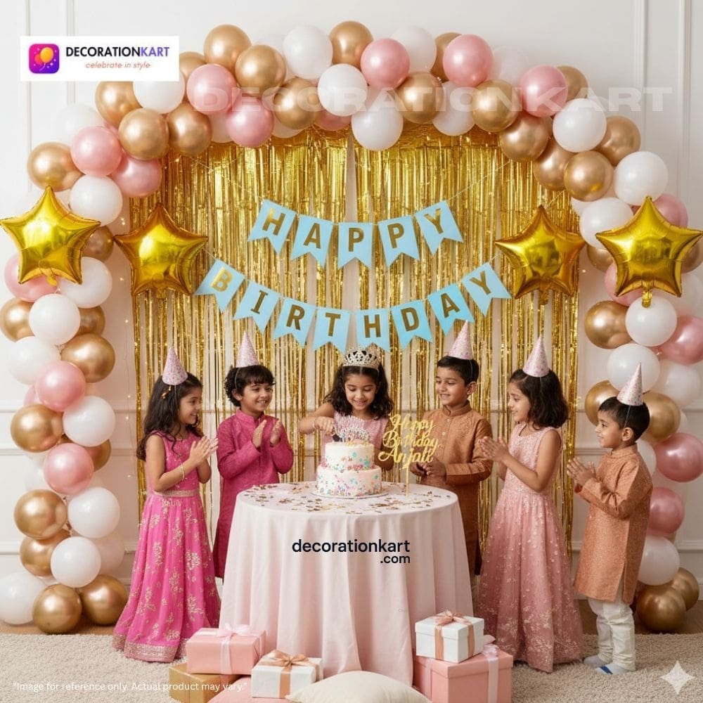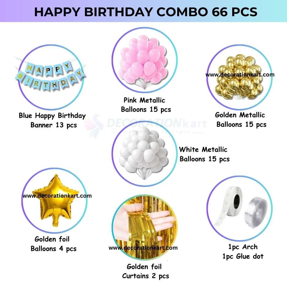 - Birthdays are milestones that deserve to be celebrated with joy, color, and unforgettable memories. The DECORATIONkart 66 Pcs Birthday Party Decoration DIY Kit is designed to make your celebrations effortless yet stunning. With a bold blue cardstock banner, shimmering golden curtains, and a playful mix of metallic balloons in golden, pink, and white, this kit transforms any space into a stylish, festive, and picture‑perfect party zone. Whether you’re planning a child’s birthday, a teenager’s milestone, or an adult’s surprise party, this all‑in‑one kit ensures your décor looks professional, vibrant, and full of life.