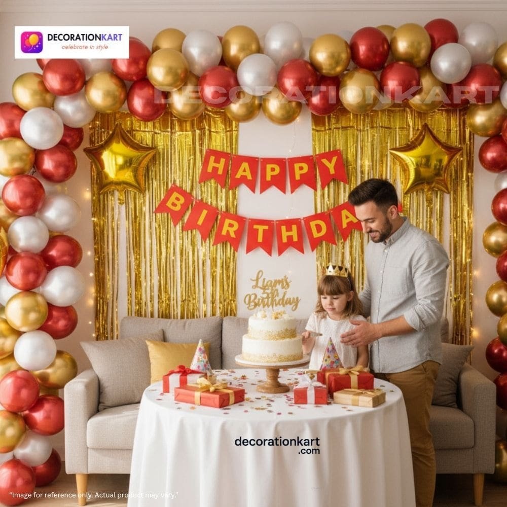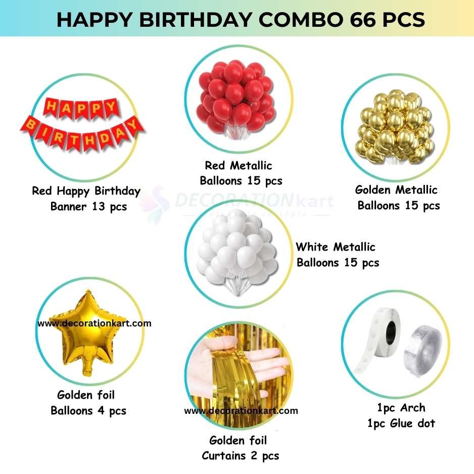 - Make birthdays unforgettable with the DECORATIONkart 66 Pcs Birthday Party Decoration DIY Kit, a complete set designed to bring elegance, festivity, and joy to any celebration. With a bold red cardstock banner, shimmering golden curtains, and a trio of metallic balloons, this kit ensures your party space looks professional, vibrant, and picture‑perfect. Whether you’re hosting a child’s birthday, a milestone celebration, or a surprise party, this all‑in‑one kit saves time, reduces stress, and guarantees stunning results.