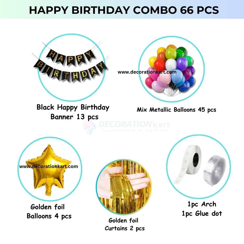 • Birthdays are milestones that deserve to be celebrated with color, sparkle, and unforgettable memories. The DECORATIONkart 66 Pcs Birthday Party Decoration DIY Kit is designed to make your celebrations effortless yet stunning. With a bold black cardstock banner, shimmering golden curtains, and a vibrant mix of multicolor metallic balloons, this kit transforms any space into a stylish, festive, and picture‑perfect party zone. Whether you’re planning a child’s birthday, a teenager’s milestone, or an adult’s surprise party, this all‑in‑one kit ensures your décor looks professional, vibrant, and full of life.
