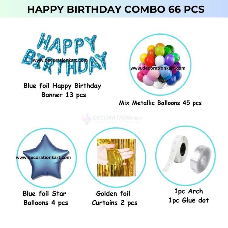 Be the first to review “DECORATIONkart 66 Pcs Birthday Party Decoration DIY Kit – Blue Dotted Foil Banner, Golden Fringe Curtains, Multicolor Metallic Balloons & Star Foils – Vibrant DIY Celebration Combo Set”