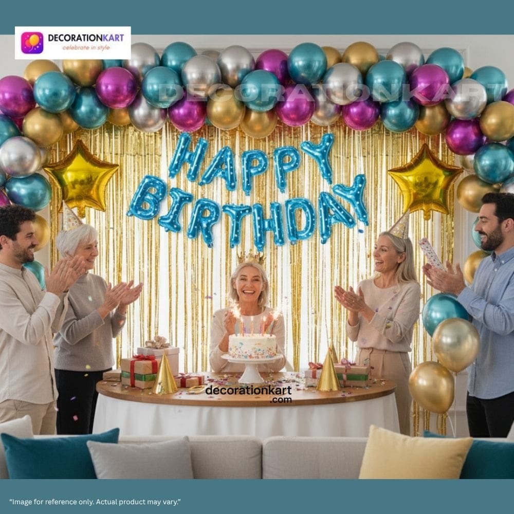This thoughtfully curated kit from DECORATIONkart is built for convenience and creativity. At the heart of the setup is a cheerful blue dotted foil “Happy Birthday” banner with 16-inch letters that instantly sets the tone for celebration. Paired with two shimmering golden fringe curtains, the backdrop becomes a glamorous focal point — perfect for cake-cutting ceremonies, selfies, and group photos. The coordinated color palette ensures a polished, professional look that suits any age group.