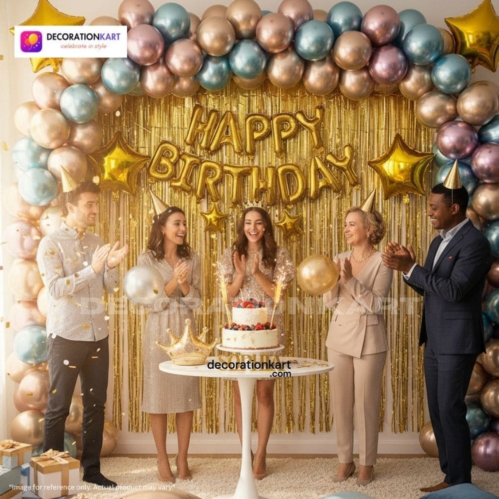 This thoughtfully curated kit from DECORATIONkart is built for convenience and creativity. At the heart of the setup is a radiant golden foil “Happy Birthday” banner with 16-inch letters that instantly sets the tone for celebration. Paired with two shimmering golden fringe curtains, the backdrop becomes a glamorous focal point — perfect for cake-cutting ceremonies, selfies, and group photos. The coordinated gold theme ensures a polished, professional look that suits any age group.