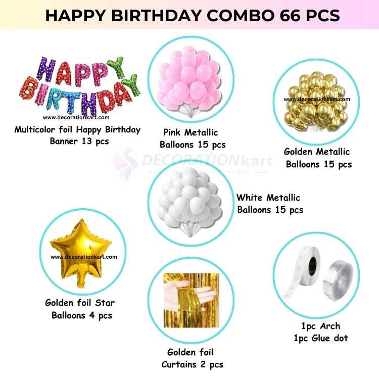 - Turn any birthday into a vibrant celebration with the DECORATIONkart 66 Pcs Birthday Party Decoration DIY Kit — a complete combo set designed to bring color, joy, and elegance to your party space. Whether you're hosting a bash for a child, teen, or adult, this kit delivers a visually stunning setup that’s easy to assemble and unforgettable in impact.