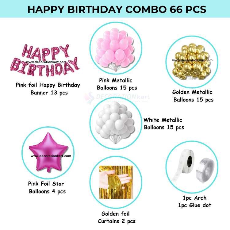 - Make birthdays shine with elegance and joy using the DECORATIONkart 66 Pcs Birthday Party Decoration DIY Kit—a complete celebration solution designed to transform any space into a festive, photo-ready party zone. Whether you're planning a birthday for a child, teen, or adult, this all-in-one combo set offers everything you need to create a stunning atmosphere with minimal effort and maximum impact.