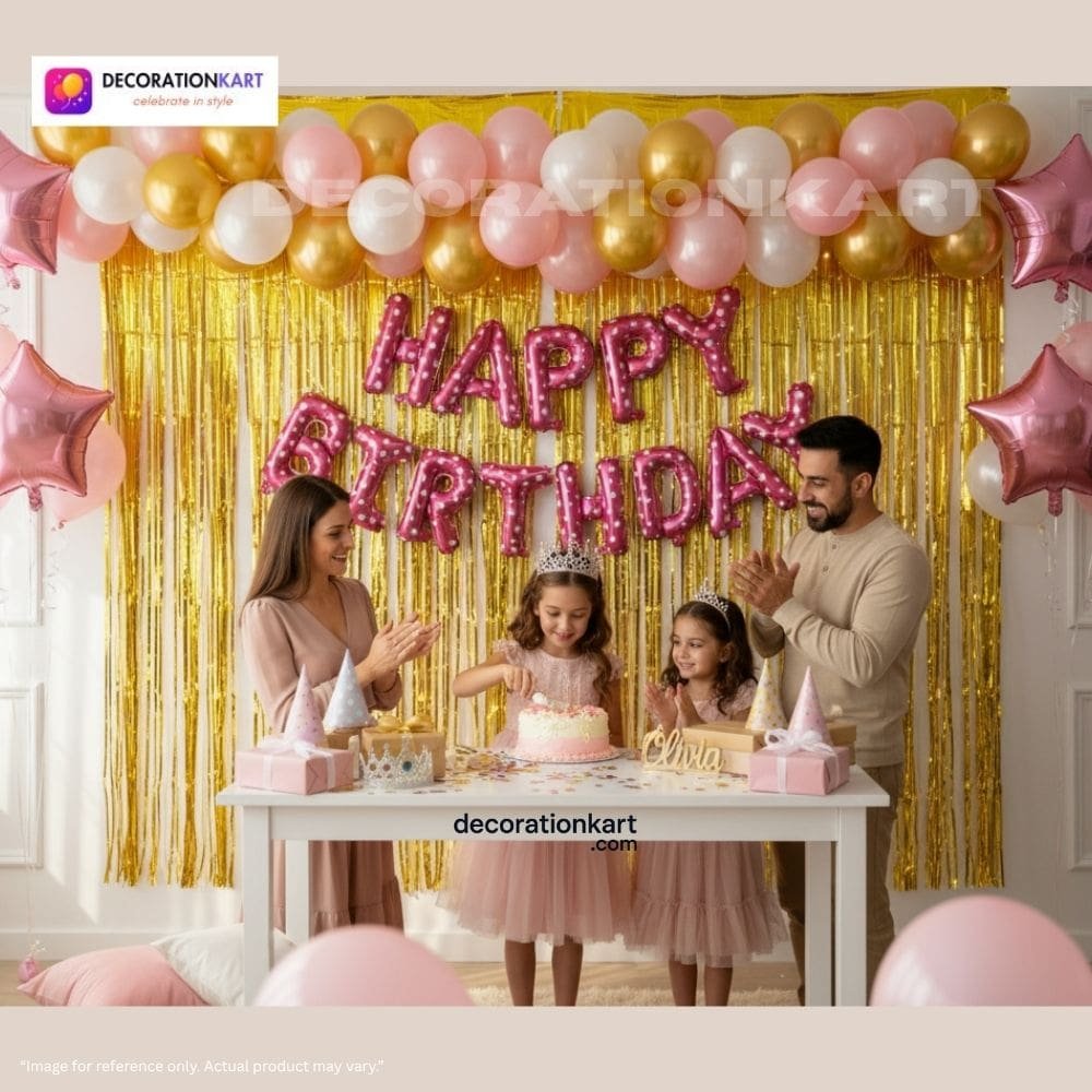This thoughtfully curated kit from DECORATIONkart is built for convenience, creativity, and celebration. At the heart of the setup is a vibrant pink foil “Happy Birthday” banner with 16-inch letters that instantly sets the tone for joy. Paired with two shimmering golden fringe curtains, the backdrop becomes a glamorous focal point—perfect for cake-cutting ceremonies, selfies, and group photos. The coordinated color palette ensures a polished, professional look that suits any age group. - 🎈 Elegant Metallic Balloons: