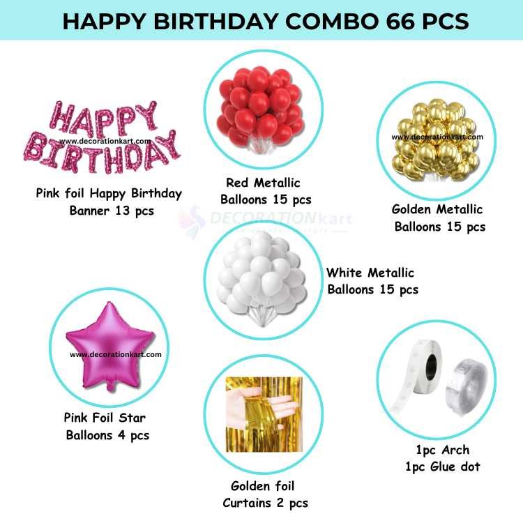 • Celebrate birthdays with elegance, color, and joy using the DECORATIONkart 66 Pcs Birthday Party Decoration DIY Kit—a complete solution for transforming any space into a festive celebration zone. Whether you're planning a birthday for a child, teen, or adult, this all-in-one combo set offers everything you need to create a stunning atmosphere with minimal effort and maximum impact.