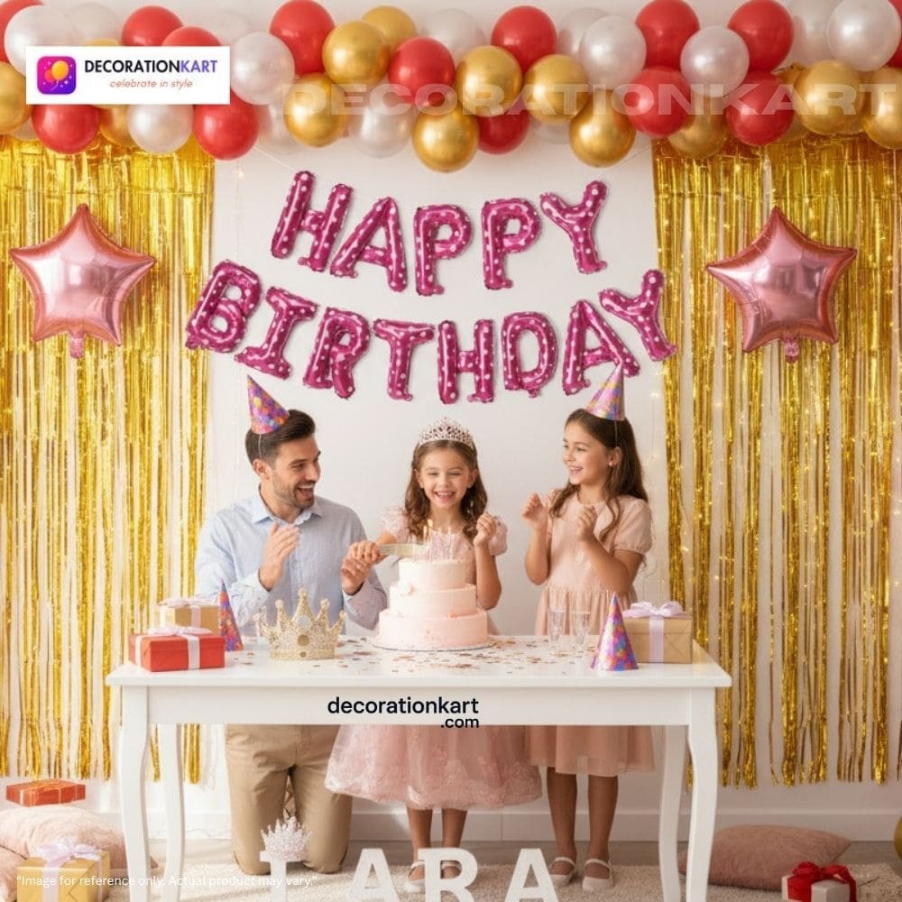 This thoughtfully curated kit from DECORATIONkart is built for convenience, creativity, and celebration. At the heart of the setup is a vibrant pink foil “Happy Birthday” banner with 16-inch letters that instantly sets the tone for joy. Paired with two shimmering golden fringe curtains, the backdrop becomes a glamorous focal point—perfect for cake-cutting ceremonies, selfies, and group photos. The coordinated color palette ensures a polished, professional look that suits any age group.