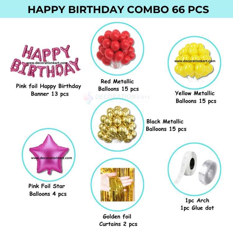 - Make birthdays burst with color, joy, and elegance using the DECORATIONkart 66 Pcs Birthday Party Decoration DIY Kit — a complete celebration combo designed to transform any space into a festive wonderland. Whether you're hosting a birthday for a child, teen, or adult, this all-in-one kit delivers everything you need to create a stunning party setup with ease and excitement.