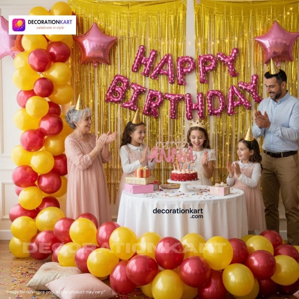 This thoughtfully curated kit from DECORATIONkart is built for convenience and creativity. At the heart of the setup is a cheerful pink foil “Happy Birthday” banner with 16-inch letters that instantly sets the tone for celebration. Paired with two shimmering golden fringe curtains, the backdrop becomes a glamorous focal point — perfect for cake-cutting ceremonies, selfies, and group photos. The coordinated color palette ensures a polished, professional look that suits any age group. - 🎈 Metallic Balloons in Bold Shades: