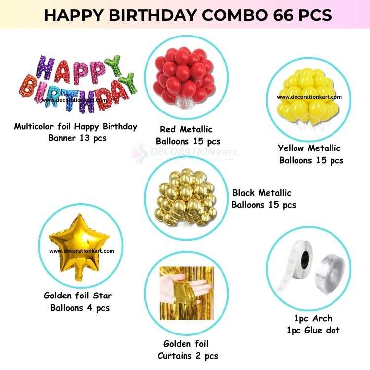 • Transform any birthday into a dazzling celebration with the DECORATIONkart 66 Pcs Birthday Party Decoration DIY Kit — a complete combo set designed to bring color, joy, and elegance to your party space. Whether you're hosting a bash for a child, teen, or adult, this kit delivers a visually stunning setup that’s easy to assemble and unforgettable in impact.