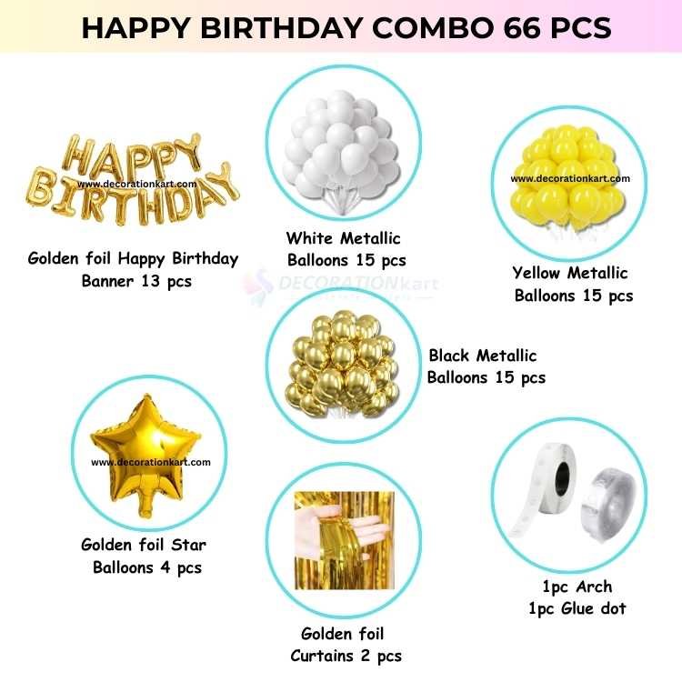 - Celebrate birthdays with elegance, warmth, and effortless style using the DECORATIONkart 66 Pcs Birthday Party Decoration DIY Kit — a complete combo set designed to transform any space into a golden celebration zone. Whether you're planning a birthday for a child, teen, or adult, this all-in-one kit delivers everything you need to create a stunning party setup with minimal effort and maximum impact.