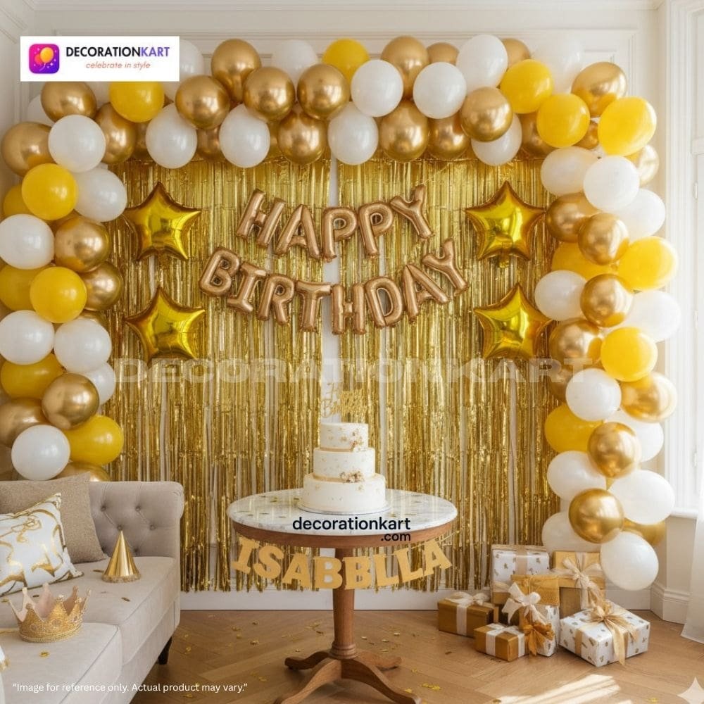 This thoughtfully curated kit from DECORATIONkart is built for convenience and creativity. At the heart of the setup is a radiant golden foil “Happy Birthday” banner with 16-inch letters that instantly sets the tone for celebration. Paired with two shimmering golden fringe curtains, the backdrop becomes a glamorous focal point — perfect for cake-cutting ceremonies, selfies, and group photos. The coordinated gold theme ensures a polished, professional look that suits any age group. - 🎈 Metallic Balloons in Elegant Shades: