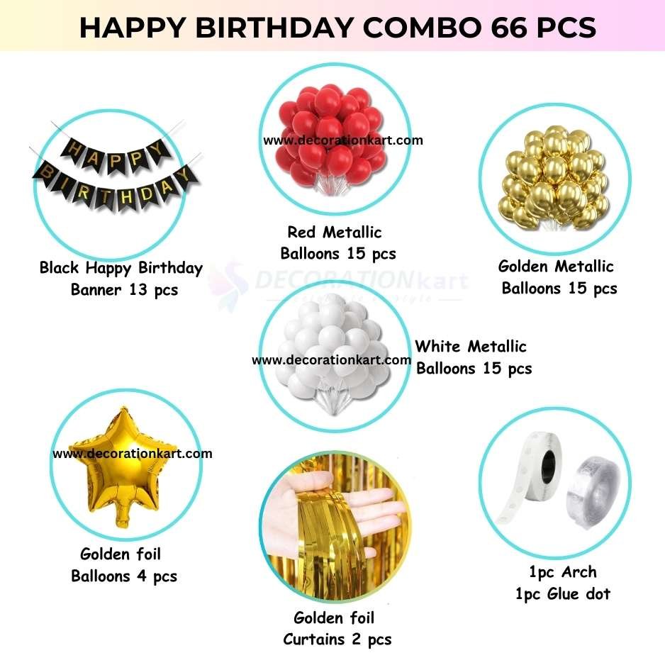 • Birthdays are milestones that deserve to be celebrated with grandeur, joy, and unforgettable memories. The DECORATIONkart 66 Pcs Birthday Party Decoration DIY Kit is designed to make your celebrations effortless yet stunning. With a bold black cardstock banner, shimmering golden curtains, and a vibrant mix of metallic balloons in golden, red, and white, this kit transforms any space into a stylish, festive, and picture‑perfect party zone. Whether you’re planning a child’s birthday, a teenager’s milestone, or an adult’s surprise party, this all‑in‑one kit ensures your décor looks professional, vibrant, and full of life.