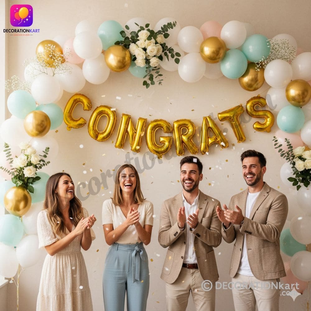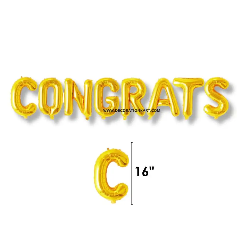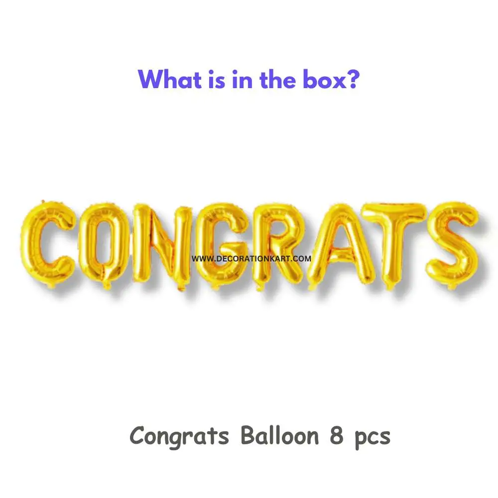 - When it comes to celebrating milestones, nothing says it better than DECORATIONkart CONGRATS Golden Foil Balloons. Designed to add sparkle and joy to your special occasion, this premium foil balloon set spells out “CONGRATS” in bold metallic golden letters. Whether it’s a graduation, wedding, anniversary, or achievement party, these balloons instantly create a festive and glamorous backdrop.