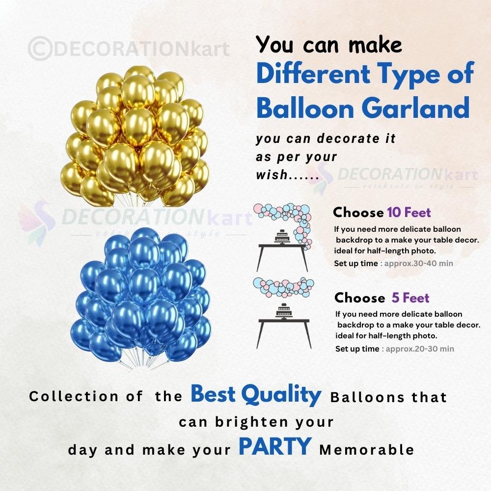 Add a luxurious touch to your celebration with this combo of 50 pcs metallic golden and 50 pcs metallic blue balloons. Perfect for birthdays, anniversaries, or baby showers, these balloons help you create bold and elegant garlands, backdrops, or table centerpieces.