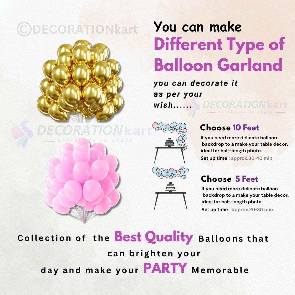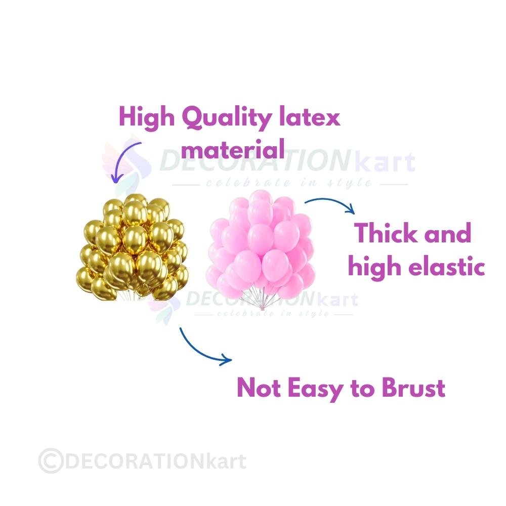 Add a luxurious touch to your celebration with this combo of 50 pcs metallic golden and 50 pcs metallic pink balloons. Perfect for birthdays, anniversaries, or baby showers, these balloons help you create charming garlands, backdrops, or table centerpieces.