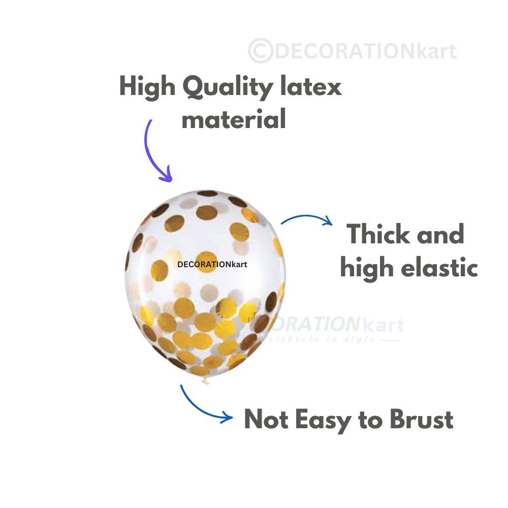 - STURDY | REUSABLE | BUILT TO LAST β This golden balloons for decoration are made sturdy enough to stand the long-hour display. Inflate slowly with air, fill 90% of the balloons space that could allow the balloon to expand completely. Perfect for happy birthday decoration items, happy anniversary decoration kit, kids birthday decoration items. Make your party balloons set complete with our gold confetti balloons for decoration.