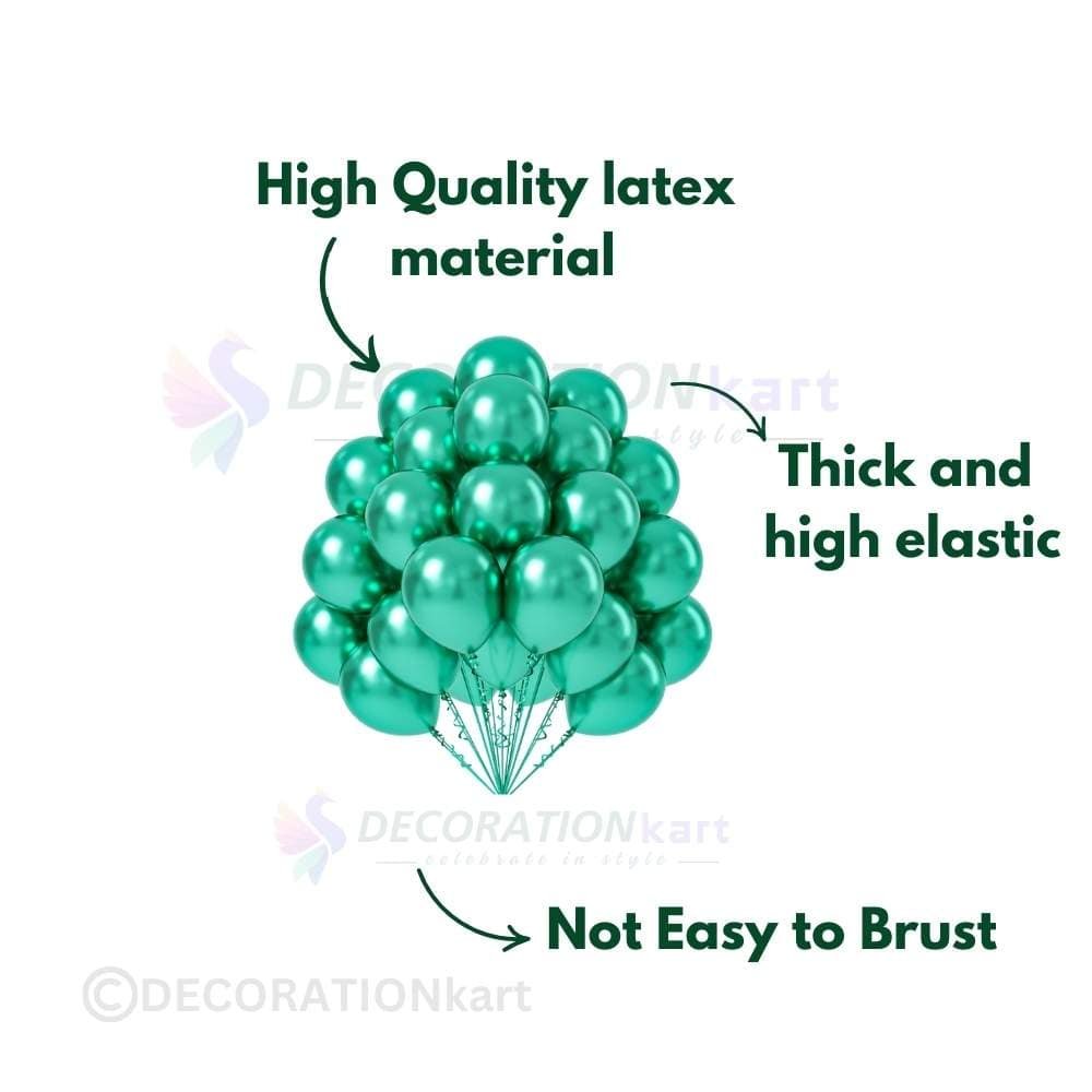 - PREMIUM GREEN BALLOONS FOR DECORATION: Decorationkart offers a set of 50 pcs, 100 pcs, 150 pcs green balloons made of durable chrome finish latex that ensures a rich, glossy look. These 12-inch green balloons are perfect for balloon arches, balloon bunches, or wall backdrops. Ideal as balloons for decoration, they blend beautifully into a green theme birthday decoration and can be mixed with other metallic balloons to elevate your balloon decoration kit with elegance and vibrancy.