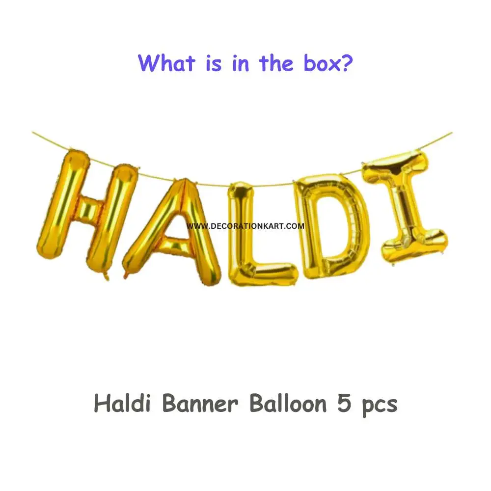 - When it comes to Haldi ceremonies, vibrant décor and joyful vibes set the stage for unforgettable memories. DECORATIONkart HALDI Golden Foil Balloons are designed to bring that extra sparkle and elegance to your special day. Crafted with premium quality foil and finished in a rich metallic golden shine, this balloon set spells out the word “HALDI” in bold, eye‑catching letters. Whether you are planning a traditional family function or a grand wedding celebration, these balloons instantly elevate the atmosphere and create a festive backdrop that guests will admire.