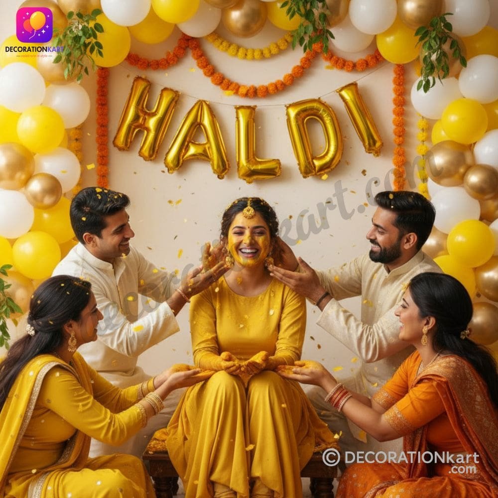 - Decorating for a Haldi function can be time‑consuming, but with DECORATIONkart, you get décor that is both stylish and easy to set up. These balloons can be arranged in multiple ways—hung on walls, tied with ribbons, or combined with marigold garlands and fairy lights. They are also perfect for creating a photo booth corner where guests can capture memories against a glamorous backdrop. The versatility of these balloons makes them suitable not only for Haldi but also for weddings, engagements, anniversaries, and festive parties.