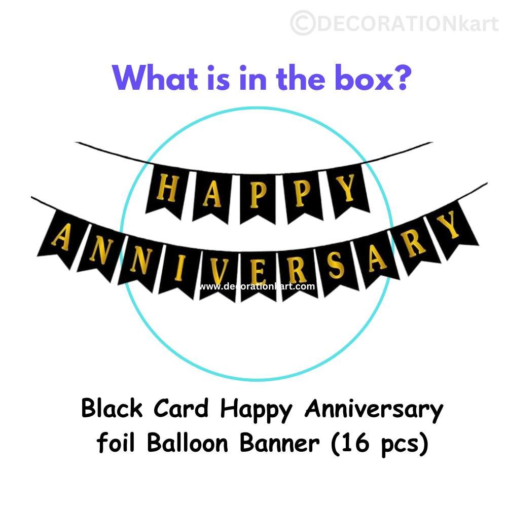 - Celebrate love, commitment, and timeless elegance with DECORATIONkart’s HAPPY ANNIVERSARY Black Card Banner. Whether you're planning a romantic dinner, a surprise bedroom makeover, or a grand anniversary celebration, this banner sets the perfect tone with its classic black base and shimmering golden lettering. Designed to spell out “HAPPY ANNIVERSARY” across 16 individual cards, it creates a sophisticated and heartfelt backdrop that instantly elevates any space.