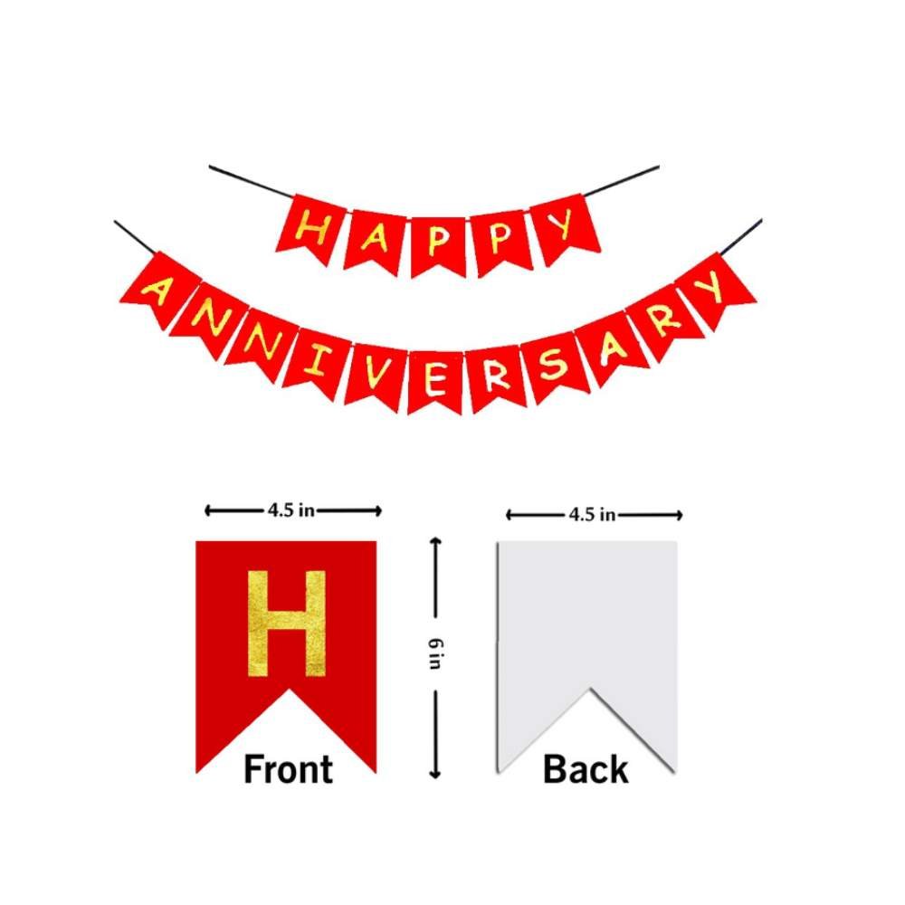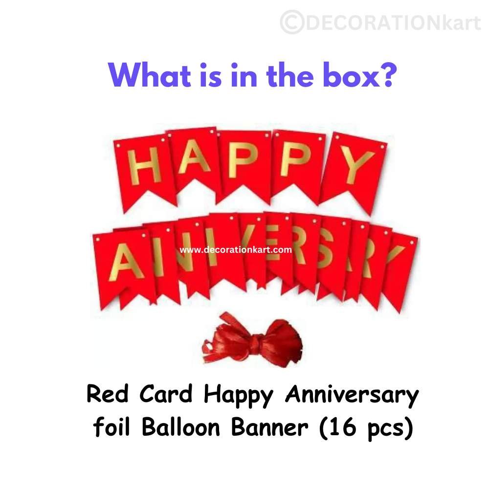 - elebrate love, commitment, and togetherness with the timeless elegance of DECORATIONkart’s HAPPY ANNIVERSARY Red Card Banner. Whether you're planning a romantic dinner, a surprise party, or a grand anniversary celebration, this banner sets the perfect tone with its bold red color and clean white lettering. Designed to spell out “HAPPY ANNIVERSARY” across 16 individual cards, it creates a heartfelt backdrop that instantly elevates any space.